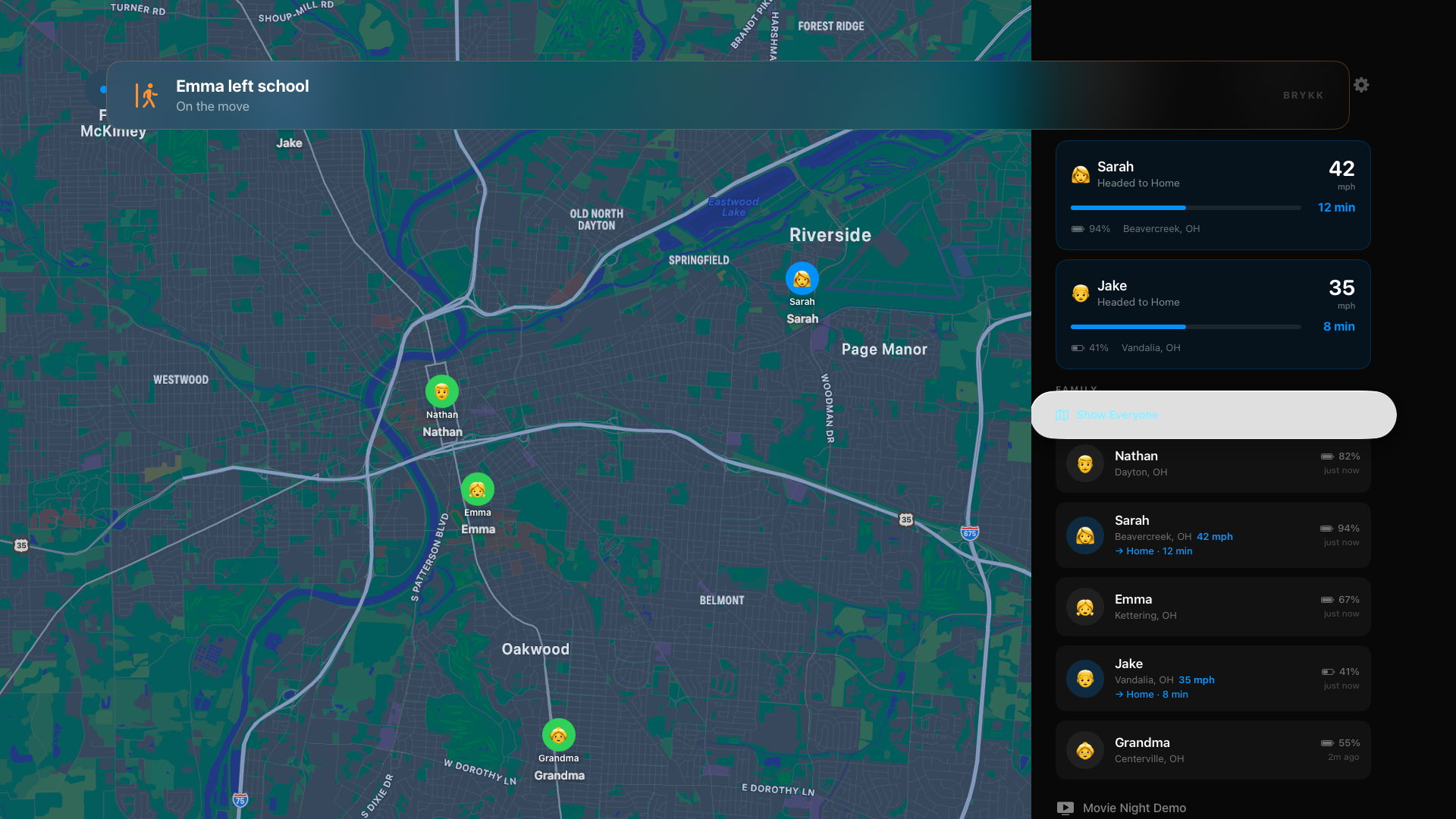 Use Siri Remote: “Hey Siri, where's Mom?” → BRYKK zooms the map to her location and reads her status aloud.