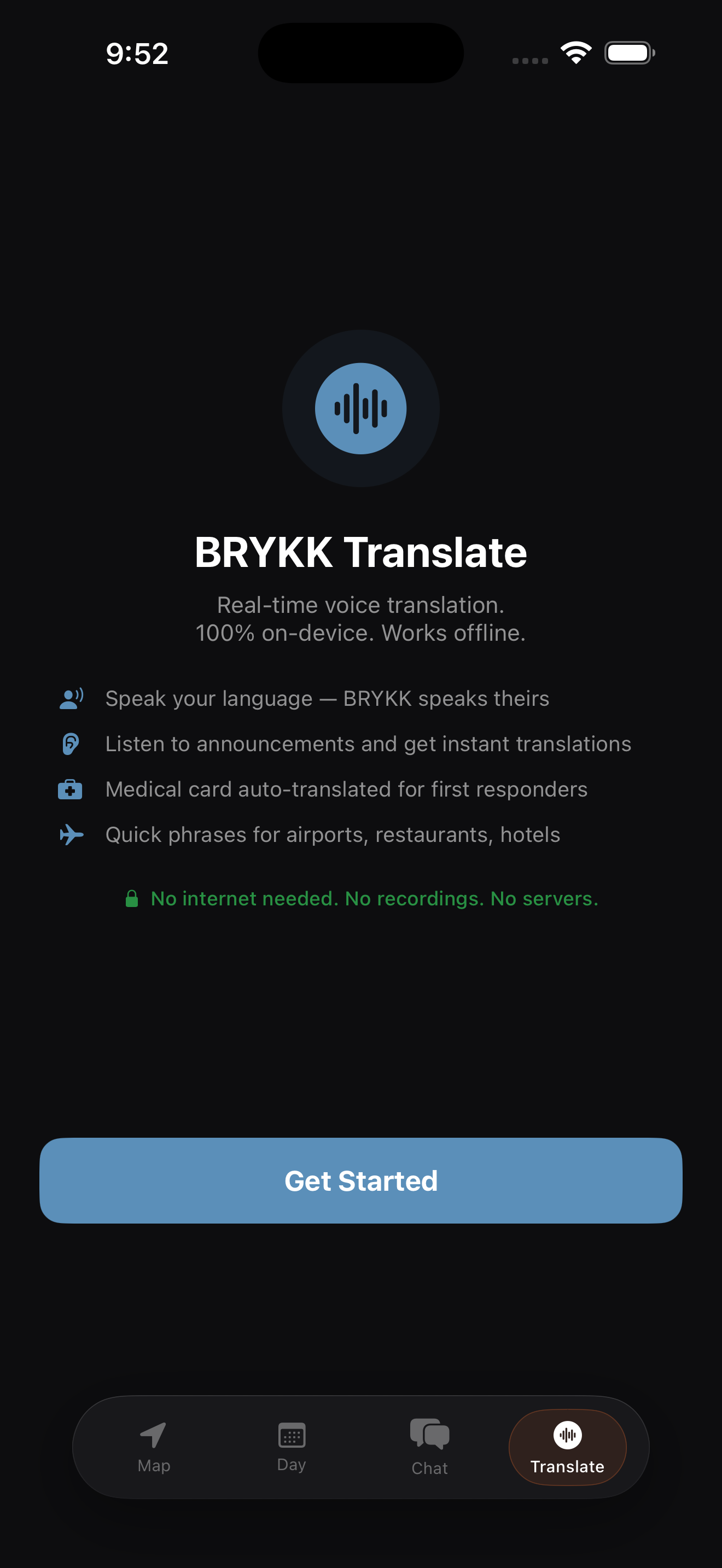 Voice translation runs entirely on-device using Apple's Speech and Translation frameworks. Nothing is sent to any server. Nothing is recorded. Nothing is logged. Your translations don't leave your phone.